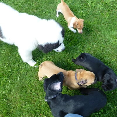Wir legen Wert darauf, dass die Welpen in ihrer Sozialisierungsphase Kontakt mit weiteren Haustieren aufnehmen können und haben daher Hundepension und Hundeschule entsprechend ausgestattet.